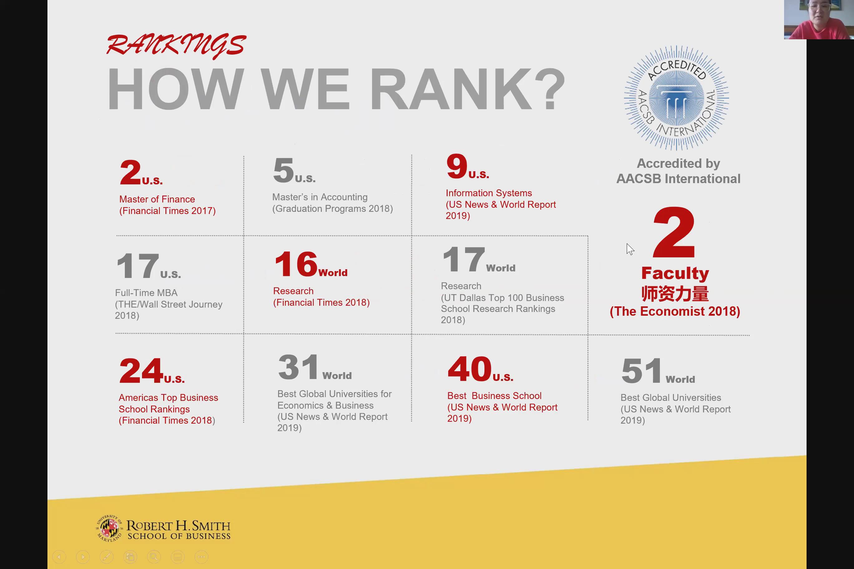2020年4月2日下午,美国马里兰大学线上推介会如期举行,史密斯商学院硕士项目招生副主任Dressie为大家带来了最前沿的招生资讯。Dressie介绍了马里兰大学史密斯商学院的历史、地理位置优势、专业排名、杰出校友、课程设置、项目录取条件以及就业指导服务等信息,并就同学们提出的问题进行逐一解答。Dressie也谈到受疫情影响,学校目前以上网课为主,希望疫情尽快得到控制后,学生能够恢复到正常的学习生活中。