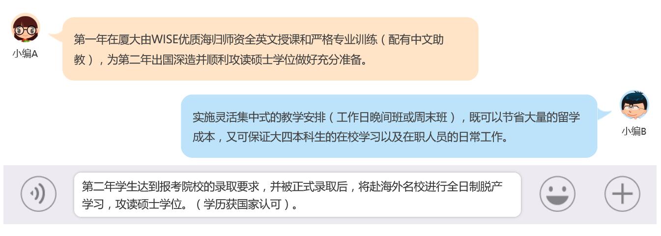 大三报名WISE海外留学硕士班,通过录取考核,大四入读。为考虑在校学习和在职人员的工作,硕士班课程分为周末班和日常班,分别在周末全天和周一至周五晚上授课。