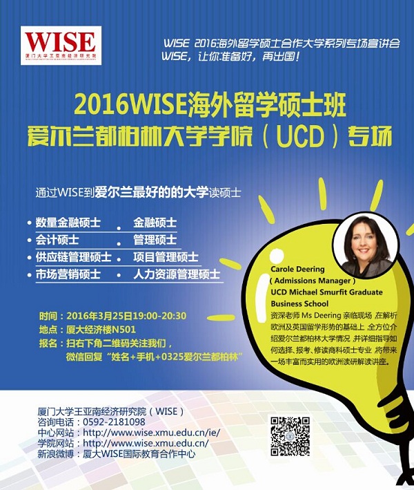 爱尔兰都柏林大学学院资深老师Ms. Carole Deering将于2016年3月25日来访WISE,和同学们共同开启爱尔兰留学的全新旅程。