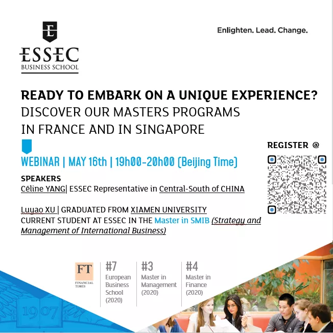厦大WISE海外留学硕士班携手法国著名高等学府ESSEC商学院资深招生官杨老师以及优秀学长,和大家探讨ESSEC商学院的强势专业,解读金融经济类硕士毕业生的就业去向,共同开启硕士留学的全新旅程!