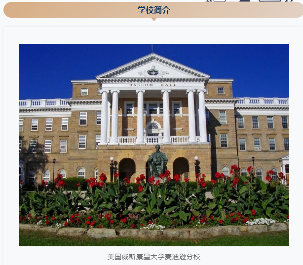 美国威斯康星大学麦迪逊分校(UW–Madison)创建于1848年,位于美国威斯康星州的首府麦迪逊,是一所世界顶尖的公立研究型大学,位列2022年U.S.News美国大学排名第42位。UW–Madison是威斯康星大学系统的旗舰学府,是北美顶尖大学学术联盟美国大学协会(Association of American Universities)的创始会员之一,也是美国著名的十大联盟(Big Ten)的创始成员之一,被誉为“公立常春藤”大学,与加州大学伯克利分校、加州大学洛杉矶分校和密歇根大学等代表了美国公立大学的最高水平。