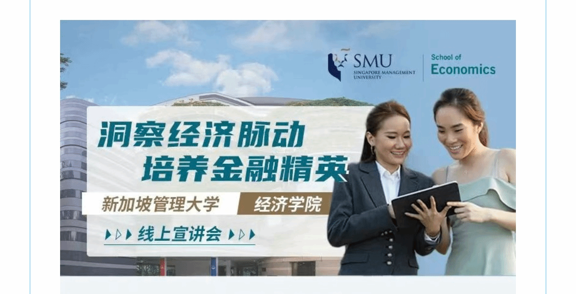 会上,经济学院市场部经理 Jenny SHENG 老师将为您细致介绍学院概况、硕士课程项目及申请事宜。此外,还有两位在读的学长学姐将带来精彩分享,讲述他们在 SMU 的就读体验、实习经历,以及在这个过程中的收获与成长。最后,在答疑环节,您可以大胆提问,我们的老师和同学们将为您一一解答。