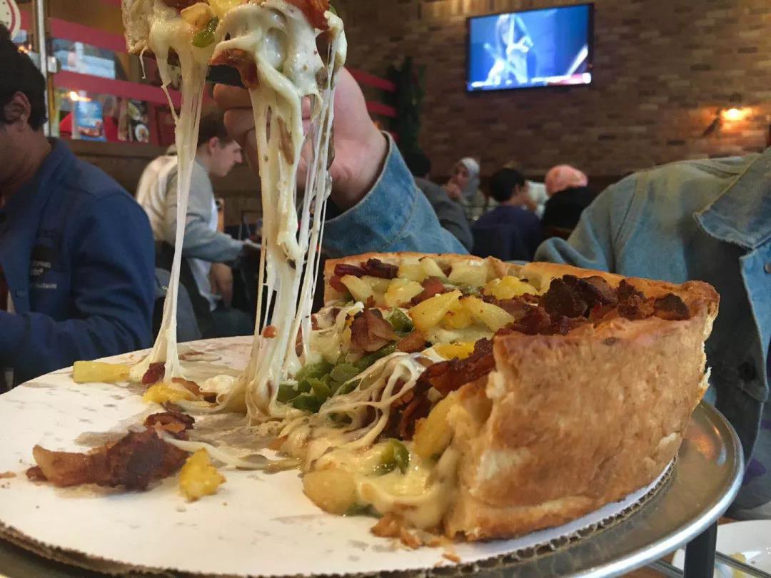 芝加哥的deep pizza:去过芝加哥的人都说,没吃过深盘披萨你就等于没去过芝加哥!之所以叫深盘披萨,正因为它的饼厚。深盘披萨需要进行两次烘焙,所以那口味真不是一般的浓香四溢。绝对让你吃到撑!
