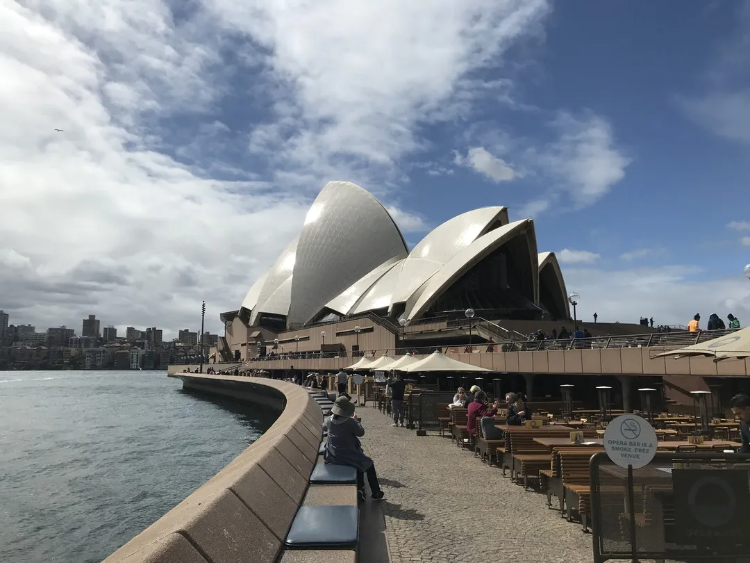 从地理位置上,它位于悉尼市区北部的Bennelong Point,从市中心出发大概要四十分钟的车程。由于建筑时间较早,它周围的道路较为狭窄和拥挤,更兼参观游客较多,所以在接近歌剧院时需要停车步行。靠近歌剧院,便能够看到分布在海边的一排咖啡厅和快餐店,各种各样的鸟类会盘旋在座位旁等待人们投喂,游客们可以在海边的长椅上喝着咖啡欣赏海景,也可以吃一顿Brunch休息一下,整体给人一种非常悠闲安逸的感觉。歌剧院由不同的小建筑组成,进入二层便可以看到功能不同的各类音乐厅,由于没有演出,大部分室内设施都是关闭的状态,因此只能在周围观看一下拍照留念。顺着主音乐厅旁的小道一直走,便可以走到一个公园里面,公园中有许多当地人锻炼、野营,在公园里还可以拍到歌剧院的全景,是一个旅游打卡的必去之处。
